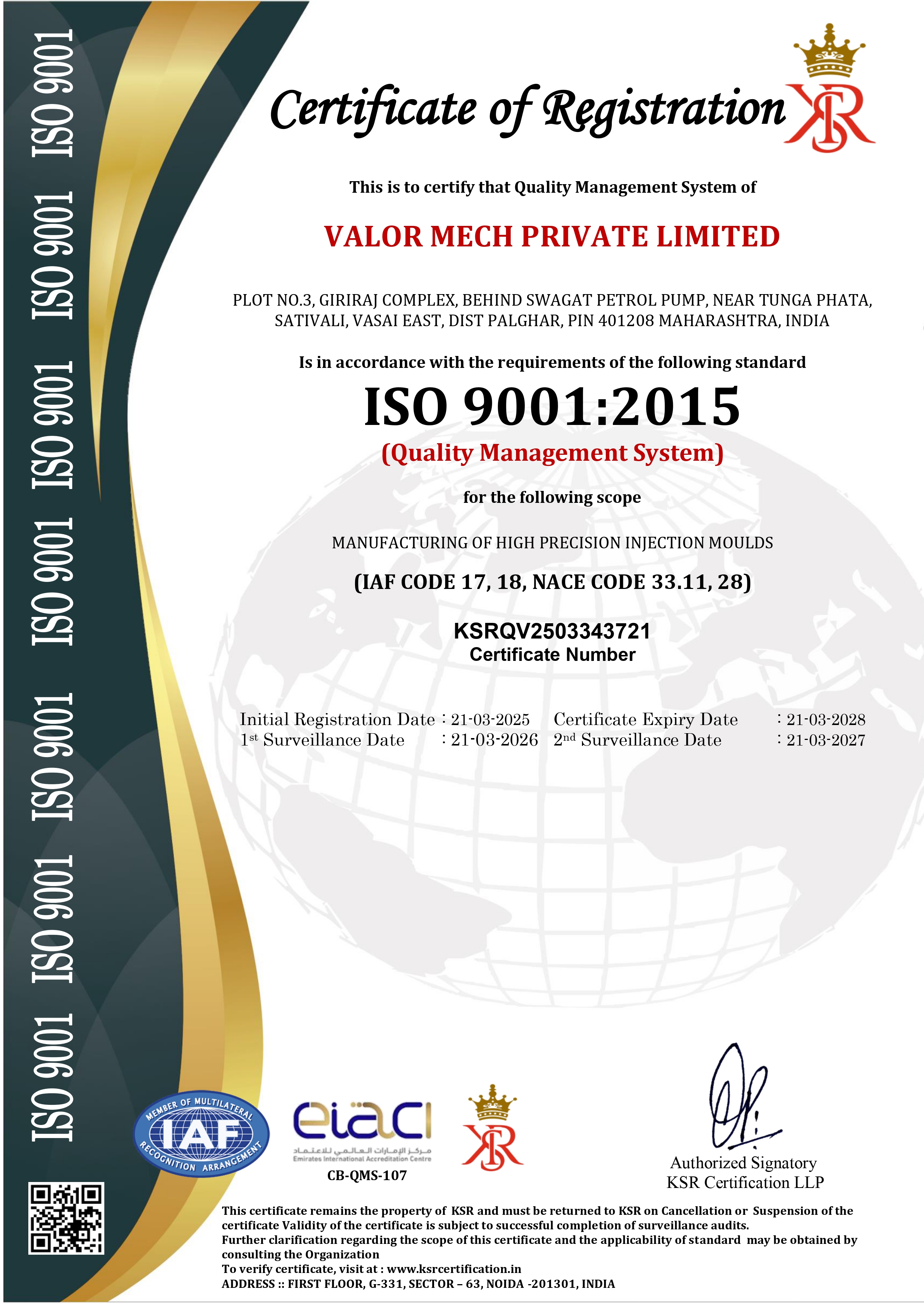 Valor Mech Pvt. Ltd. is proud to be ISO 9001:2015 certified for maintaining a world-class Quality Management System in the manufacturing of high-precision injection moulds. This certification reflects our commitment to: